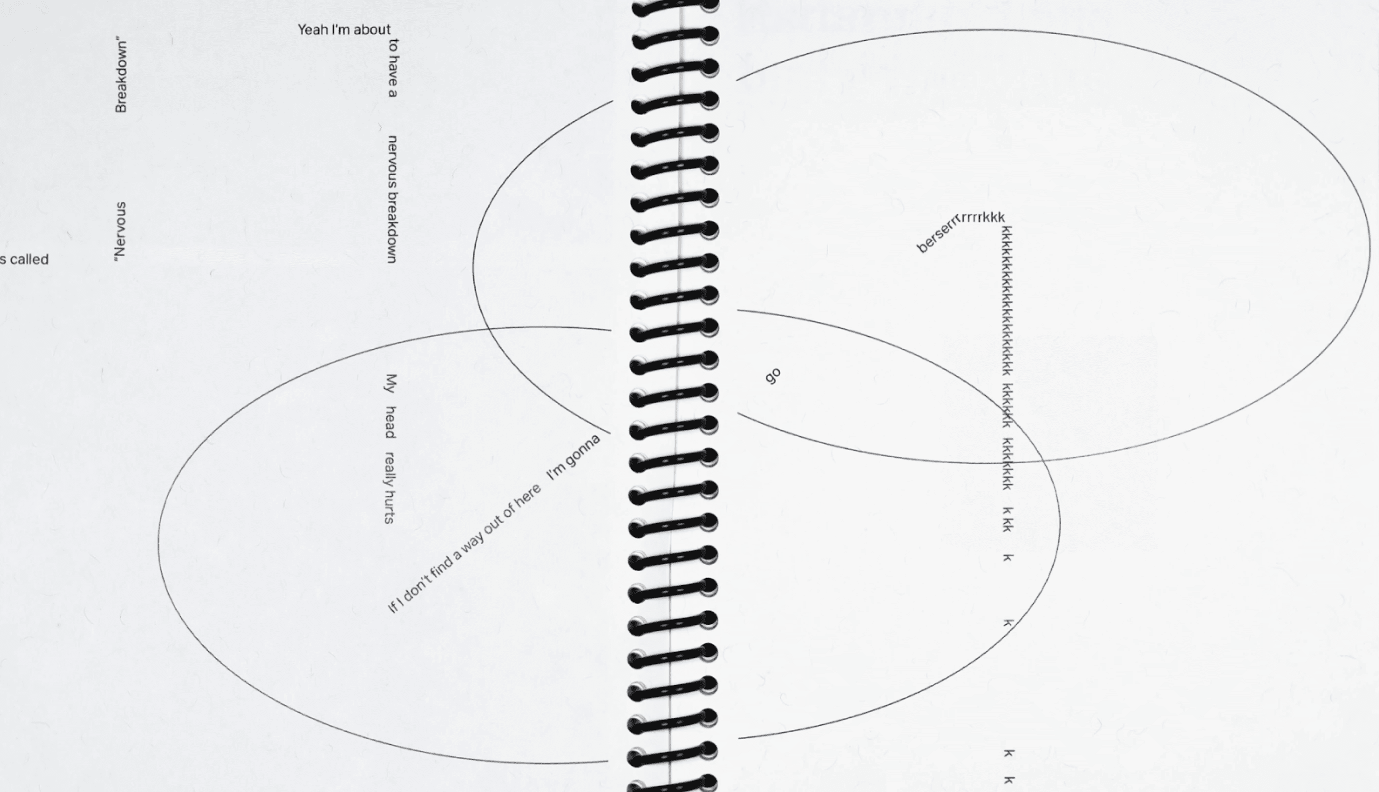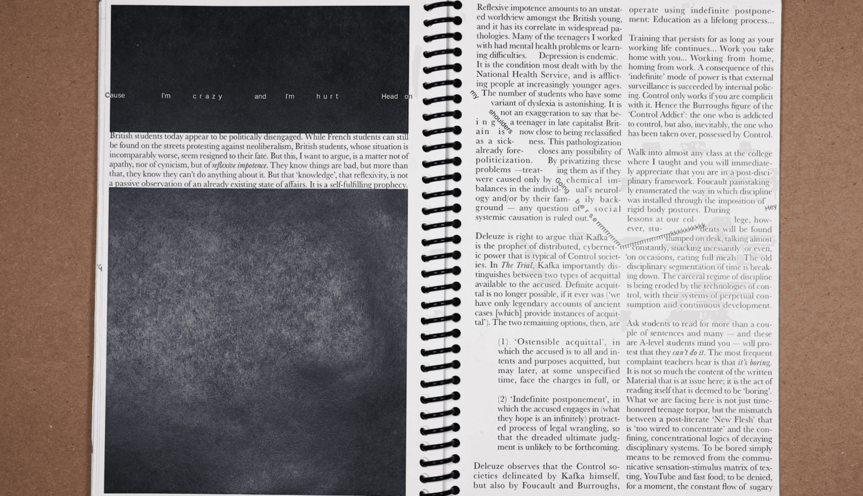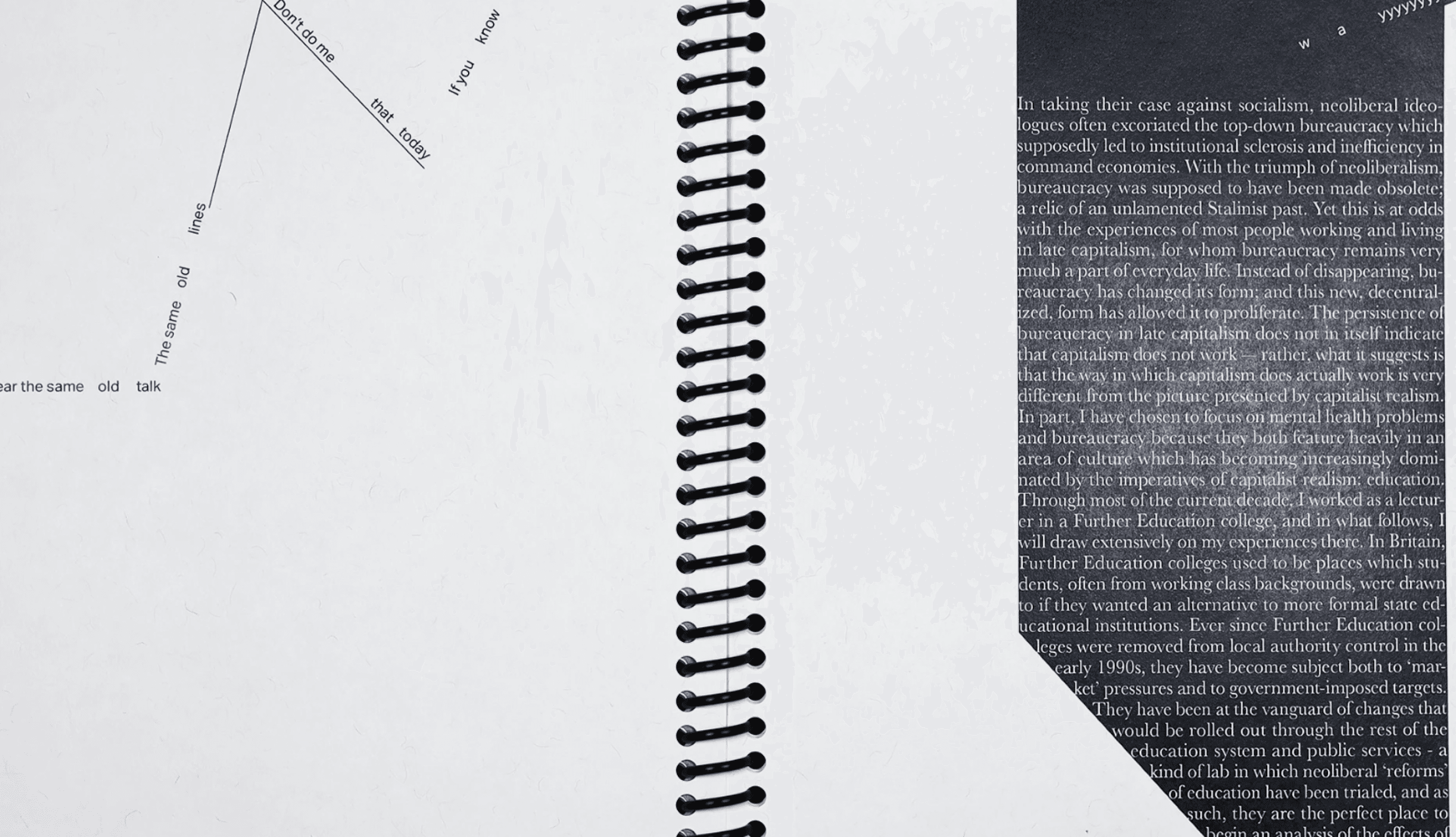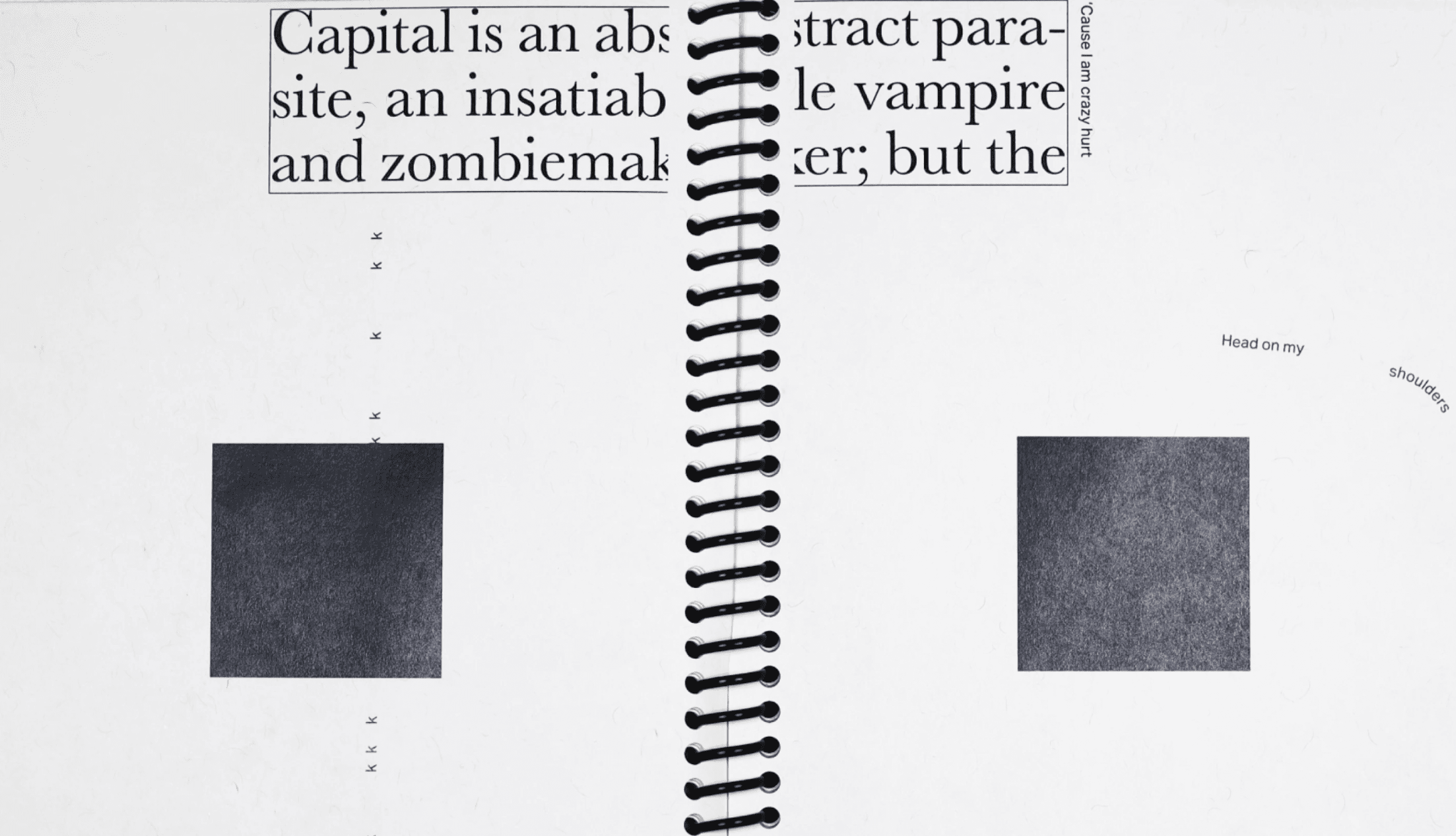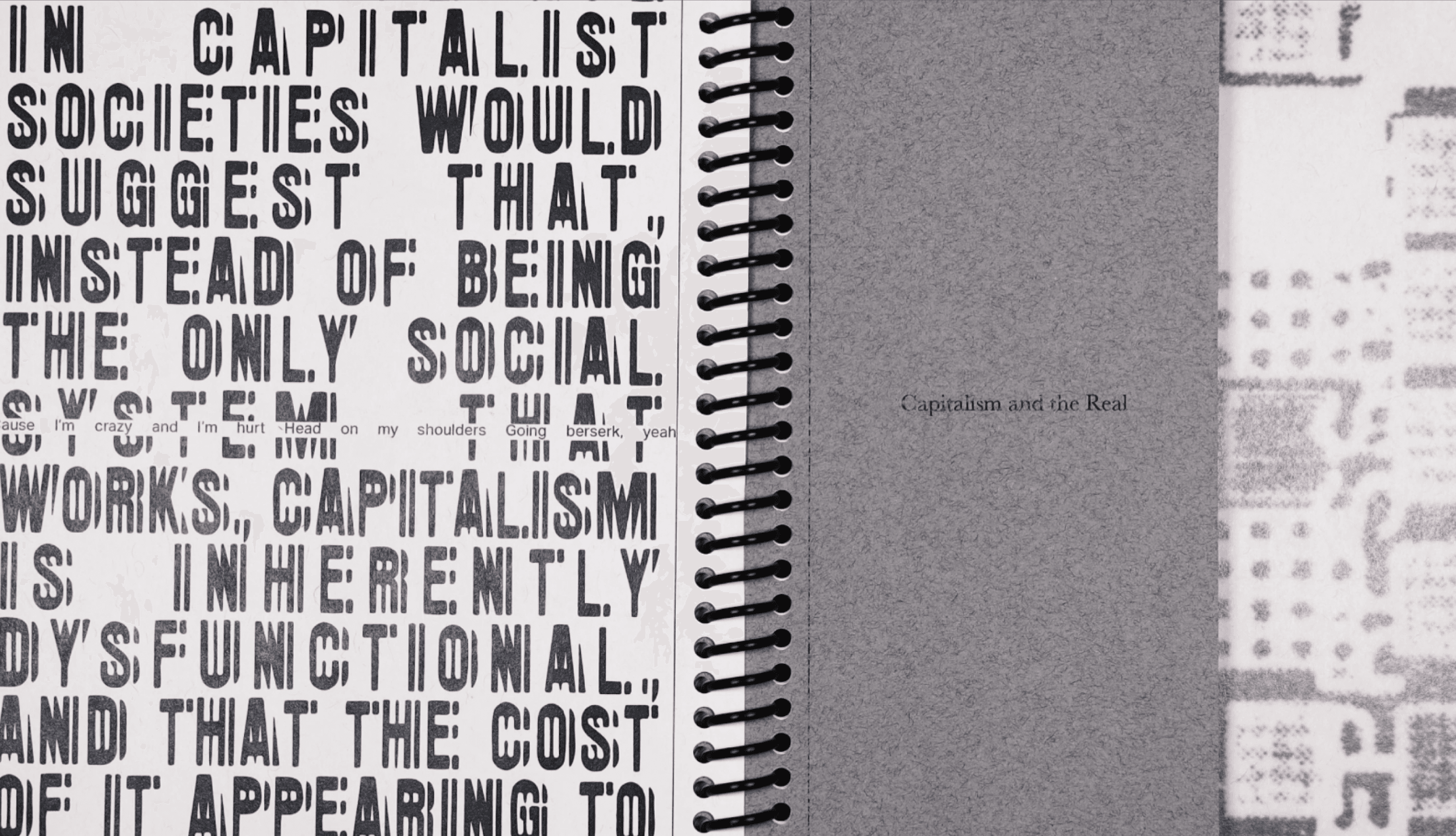 This publication attempts to rupture capitalist realism through the disruptive type treatment of song lyrics from Life During Wartime by Talking Heads and Nervous Breakdown by Black Flag, as they splice, interrupt, and separate excerpts from Fisher’s book.