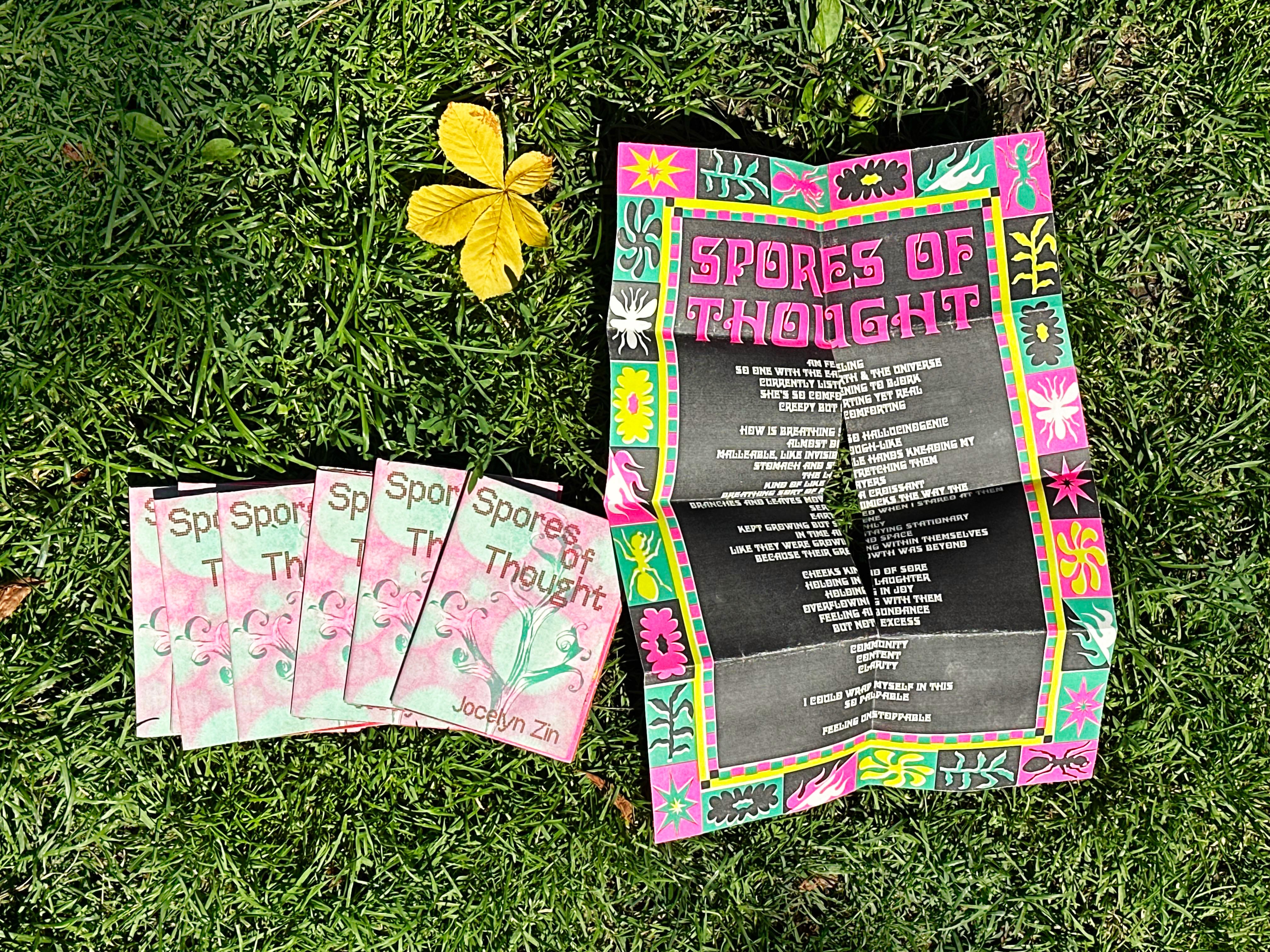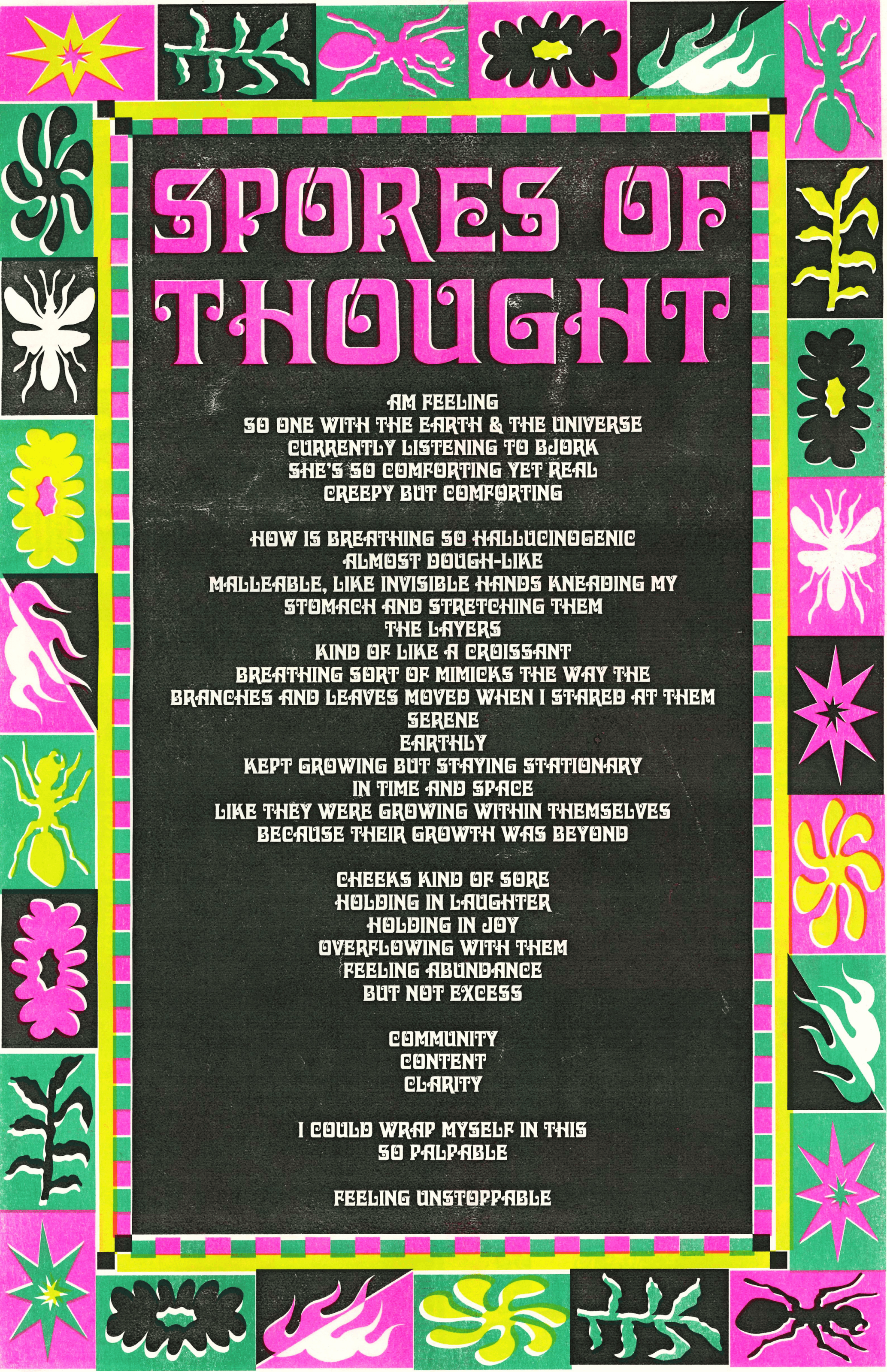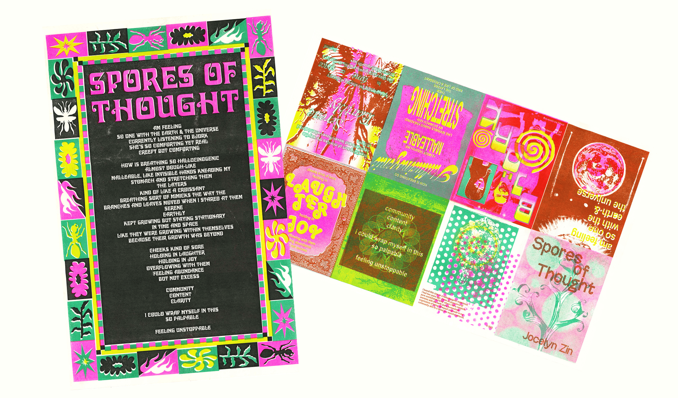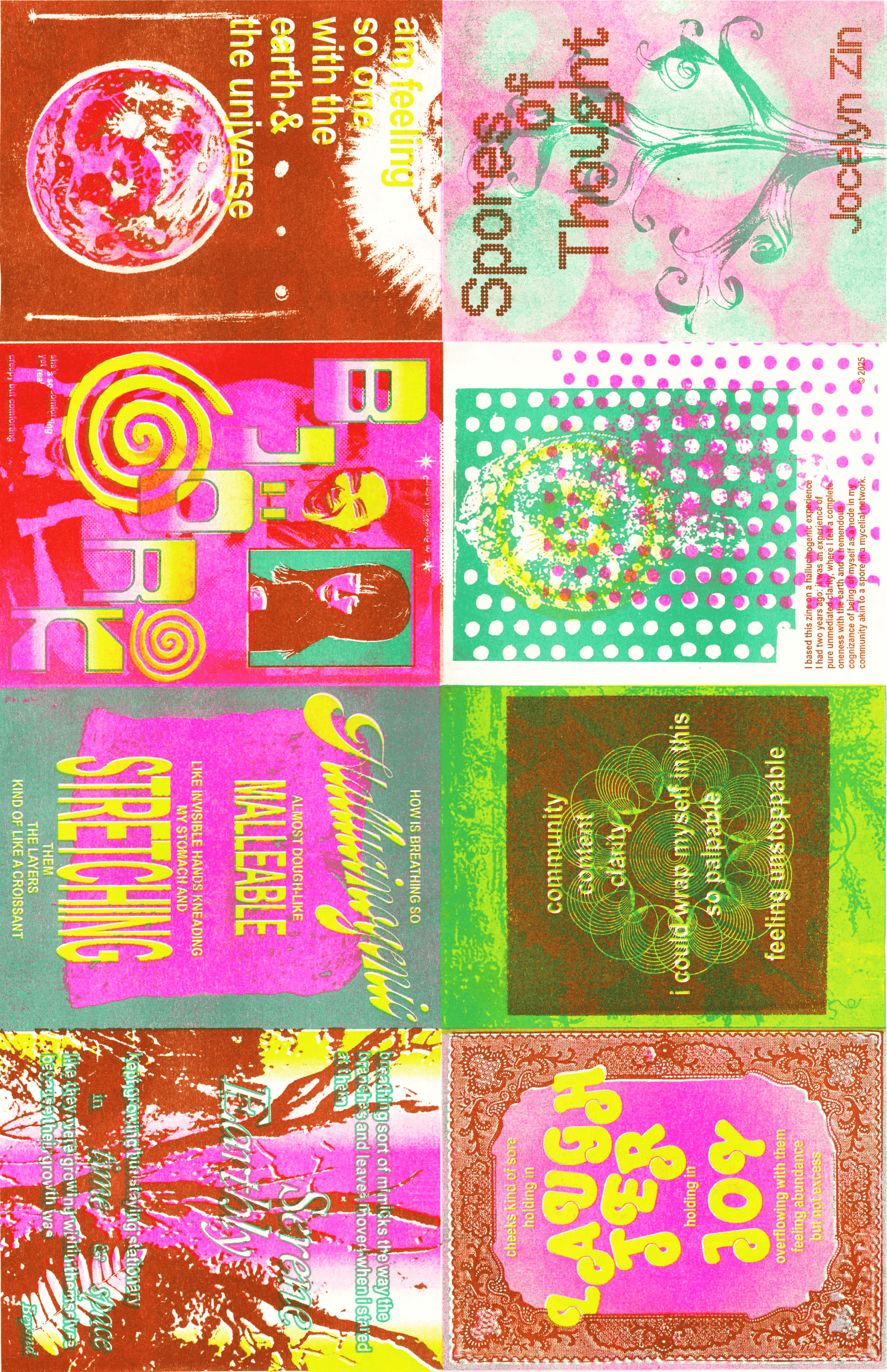 As a part of Zine Shine 2025 at Issues Magazine Shop in Toronto, this 8-page, double sided, risograph zine titled Spores of Thought depicted a piece I wrote about experiencing a sense of pure unmediated clarity, where my thoughts felt as though they flowed in mycelial patterns.